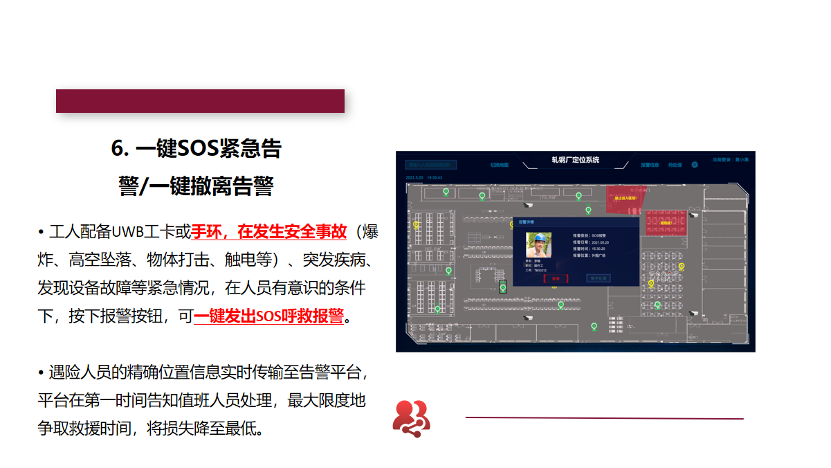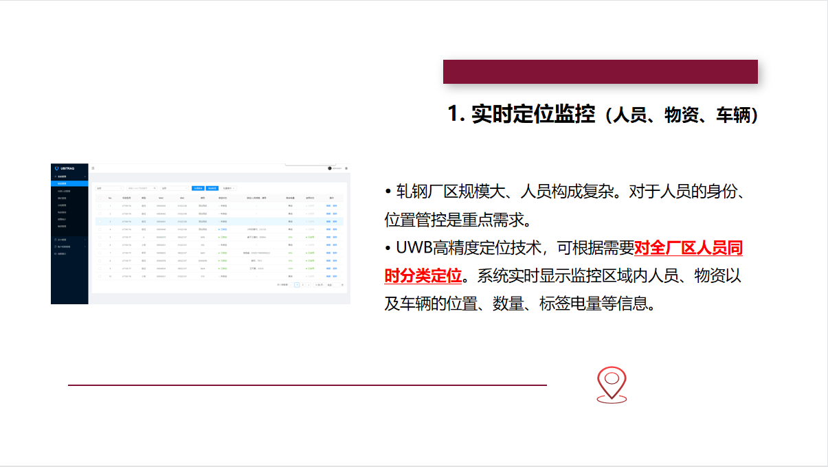全跡科技UbiTraq冶金鋼鐵高精度定位系統(tǒng),通過在廠區(qū)內(nèi)布設(shè)規(guī)定數(shù)量的UWB定位基站,實時精確地對人員、車輛、資產(chǎn)上的標簽進行定位,并將位置信息顯示在廠區(qū)的控制中心,進行安全區(qū)域管控、人員在崗監(jiān)控等,最大限度地避免事故的發(fā)生,助力冶金鋼鐵企業(yè)實現(xiàn)智慧化的安全運營管理。