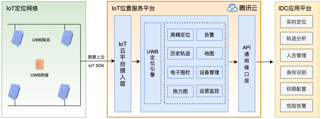 云化UWB高精度定位智能管控系統(tǒng)主要包括兩個(gè)模塊,即 IoT UWB定位網(wǎng)絡(luò)、IoT位置服務(wù)平臺,通過API通用接口層與上層的IDC應(yīng)用平臺交互,如下圖所示: